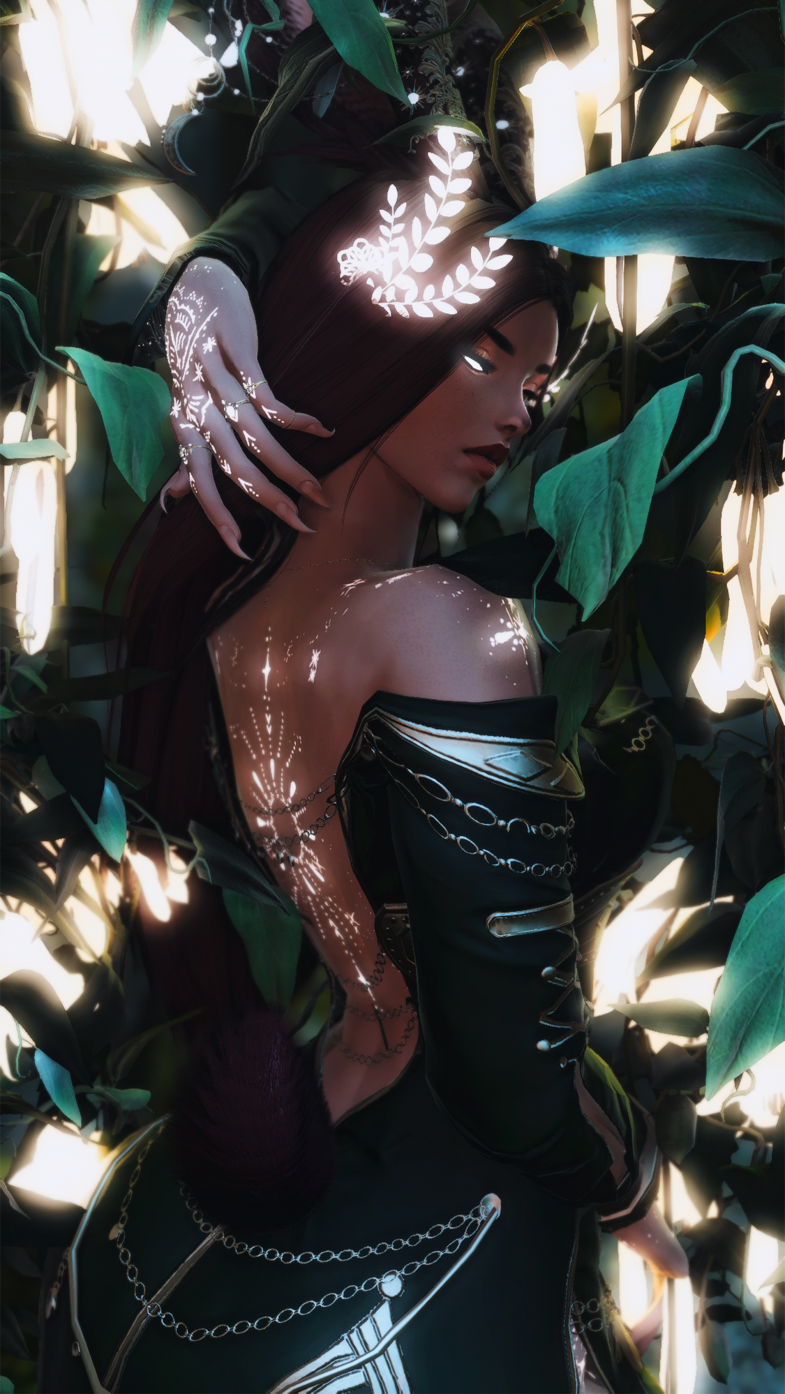 —ㅤComplexion.ㅤTanned, freckled, and covered with glowing markings depicting celestial and botanical imagery.